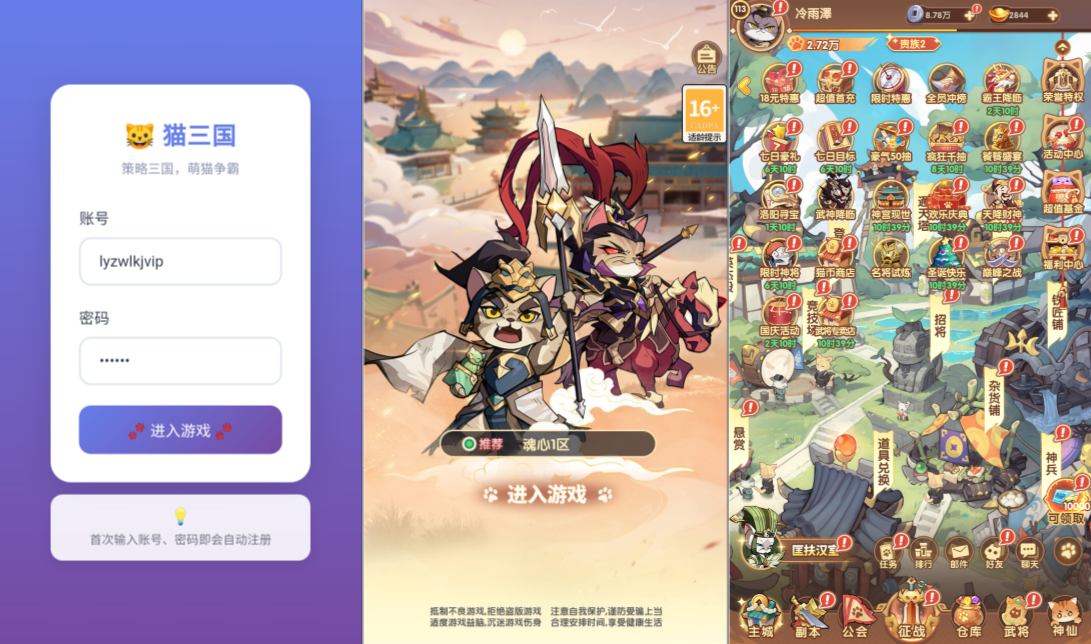 - 三网H5游戏【猫三国魂心H5代金券内购多区跨服修复版】2月最新整理Linux手工服务端+新管理后台+GM授权后台+简易安卓客户端+详细搭建教程+视频教程 2026-02-21